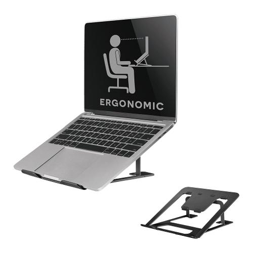 Supporto universale per laptop da 10 "a 17", con una portata massima di 5 kg. Il supporto ha sei diverse posizioni di altezza e un design pieghevole ultra sottile.