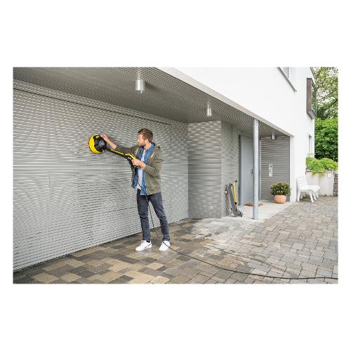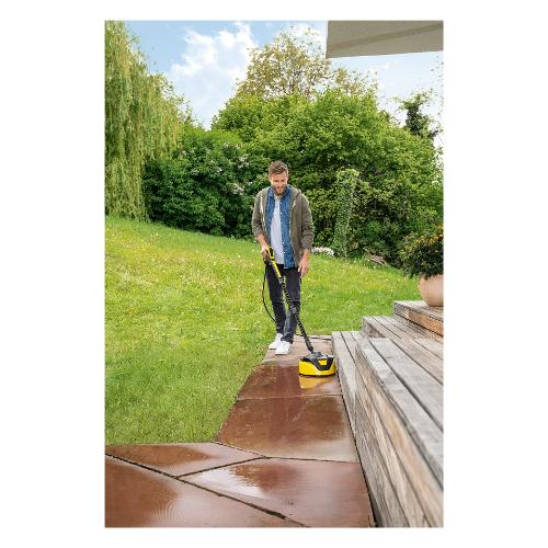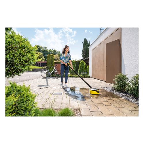 Il sistema a due getti rotanti del lavasuperfici t 5 rimuove lo sporco su grandi aree esterne, fornendo una valida alternativa per la pulizia di grandi aree esterne. Il lavasuperfici t 5 può essere regolato in modo tale che l'ugello sia posizionato alla distanza ideale dalla superficie a seconda del lavoro che si sta attuando. Ciò significa che le superfici dure, come pietra e cemento, possono essere pulite con la stessa efficacia delle superfici più delicate, come il legno. Questo accessorio consente di risparmiare circa la metà del tempo rispetto alla pulizia con un normale ugello. Il lavasuperfici t 5 protegge inoltre l'operatore e l'ambiente circostante dagli spruzzi d'acqua e "l'effetto hovercraft"rende le manovre più semplici che mai. Anche le superfici verticali, come le porte del garage, possono essere pulite in modo efficiente grazie alla maniglia ergonomica. Adatto per le gamme di idropulitrice da k 2 a k 7.