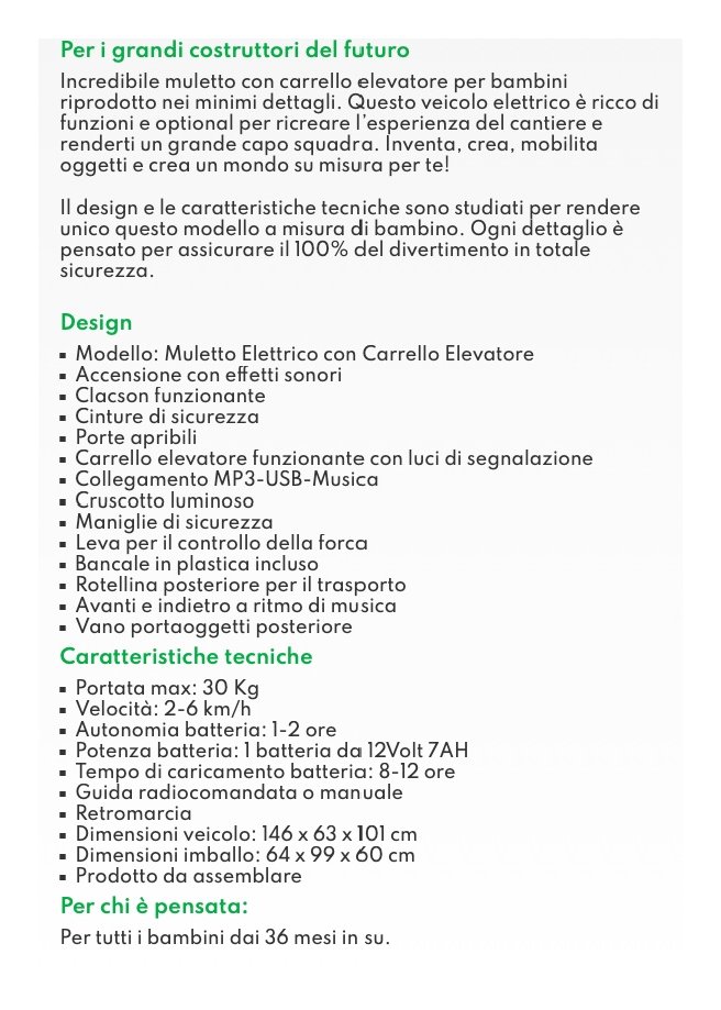 Incredibile muletto con carrello elevatore per bambini riprodotto nei minimi dettagli. Questo veicolo elettrico è ricco di funzioni e optional per ricreare l’esperienza del cantiere e renderti un grande capo squadra. Inventa, crea, mobilita oggetti e crea un mondo su misura per te! Il design e le caratteristiche tecniche sono studiati per rendere unico questo modello a misura di bambino. Ogni dettaglio è pensato per assicurare il 100% del divertimento in totale sicurezza.