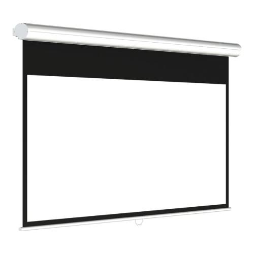 Schermo professionale manuale con cassonetto bianco in alluminio a parete o a soffitto mediante la coppia di staffe di sospensione a posizionamento libero sulla lunghezza del cassonetto.