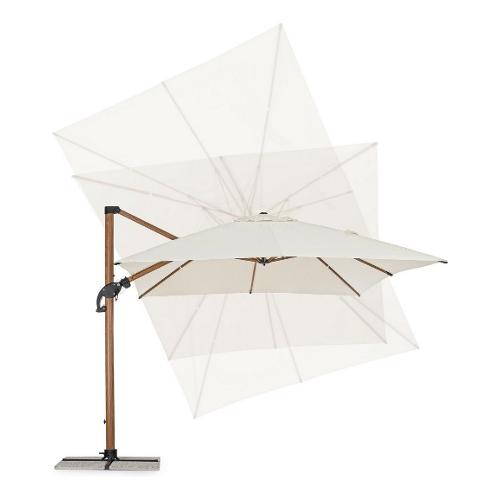 Struttura in alluminio verniciata a polvere (Poliestere) effetto legno. Palo 90x60 mm. 8 stecche 25x17 mm. Telo beige in Poliestere 250 gr/mq con rivestimento in pa (Poliammide) con camino antivento. Base a croce in acciaio. Palo girevole 360° con pedalina. Inclinazione verticale con impugnatura a 6 posizioni. Dotato di sistema per inclinazione ombrello destra-sinistra. Comprensivo di Copriombrellone. Marmette non incluse. Predisposizione lampada led cod. 0795364 e speaker cod. 0795365
