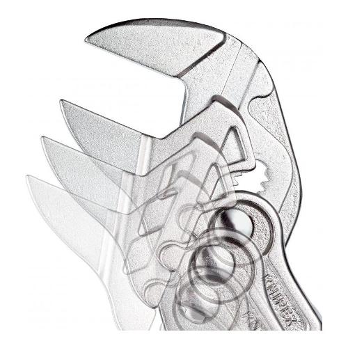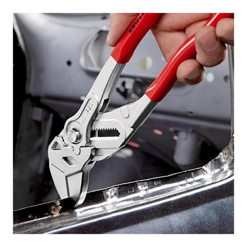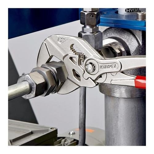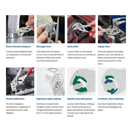 La pinza chiave piccola knipex 86 03 150 – per piccoli pezzi e condizioni di spazio ristretto Con le sue dimensioni ridotte di 150 mm, la pinza chiave sta in ogni tasca, ma è in grado di sostituire un intero assortimento di chiavi, metriche e in pollici. Con la sua regolazione continua, ha una capacità di presa fino a 27 mm ovvero 1 pollice e si regola sul pezzo in modo rapido e diretto mediante pulsante. Il perno di articolazione scatta sicuro in posizione, evitando qualsiasi spostamento involontario. Le superfici di contatto piatte delle ganasce in caso di sollecitazione si chiudono in parallelo su ogni livello di regolazione, bloccando il pezzo in modo preciso e senza gioco, senza danneggiare spigoli e superfici delicate come cromo od ottone, cosa importante ad esempio negli impianti sanitari e di riscaldamento. Lavoro confortevole La collaudata ergonomia dei manici con rivestimento in resina sintetica garantisce una presa confortevole e antiscivolo – anche per gli utilizzi frequenti. Anche gli oggetti più piccoli vengono bloccati nella pinza in modo sicuro, come in una morsa. I pezzi piani sono facilmente lavorabili grazie all’elevata forza di compressione e alle ganasce parallele. Funzione con sistema a cricchetto: la corsa fra le superfici delle ganasce permette di avvitare come con una cremagliera o un cricchetto. Questo permette di allentare o serrare velocemente i collegamenti a vite, senza dover riposizionare la chiave ad ogni movimento della vite. Svariate possibilità di impiego La pinza chiave afferra, avvita, piega e comprime anche gli oggetti caldi, taglienti, sporchi, particolarmente piccoli o scivolosi. La chiusura potente e sicura permette però anche un posizionamento delicato e dosato ad es. di mezzi connettori o giunti. Inoltre è un valido aiuto nei lavori con adesivi a contatto (compressione per l’attivazione della forza adesiva) o nella pressatura di fermacavi. E un valido ausilio anche nei lavori di montaggio, messa a punto o riparazione, ad es. nelle gite in auto, barca, moto o bicicletta. Qualità knipex: la pinza chiave 86 03 150 viene prodotta negli stabilimenti knipex di wuppertal-cronenberg con massima accuratezza e utilizzando materiali di qualità superiore. Questo utensile, come anche gli altri modelli di pinze che nascono dalla fucina di idee di knipex, è sinonimo di massima qualità e quindi – utilizzato correttamente – di straordinaria durata.