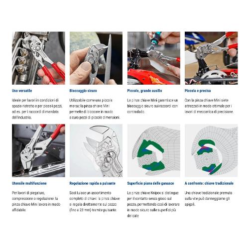 La pinza chiave afferra, avvita, piega e comprime anche gli oggetti caldi, taglienti, sporchi, particolarmente piccoli o scivolosi. La chiusura potente e sicura permette però anche un posizionamento delicato e dosato ad es. di mezzi connettori o giunti. Inoltre è un valido aiuto nei lavori con adesivi a contatto (compressione per l’attivazione della forza adesiva) o nella pressatura di fermacavi. E un valido ausilio anche nei lavori di montaggio, messa a punto o riparazione, ad es. nelle gite in auto, barca, moto o bicicletta.