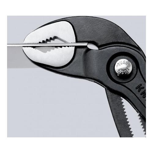 Per tubi, dadi, manicotti, per le più svariate tipologie di pezzi: l’utilizzatore professionale posiziona la pinza knipex cobra in modo rapido e preciso con una sola manovra. Il perno dell’articolazione a molla scatta bloccando la pinza in modo sicuro senza spostamenti involontari. Grazie alla regolazione fine in 18 posizioni, la pinza knipex cobra 87 01 180 è regolabile in modo ottimale in base alle varie dimensioni dei pezzi. Questa regolazione fine assicura inoltre all’utilizzatore una presa comoda in ogni posizione di apertura.