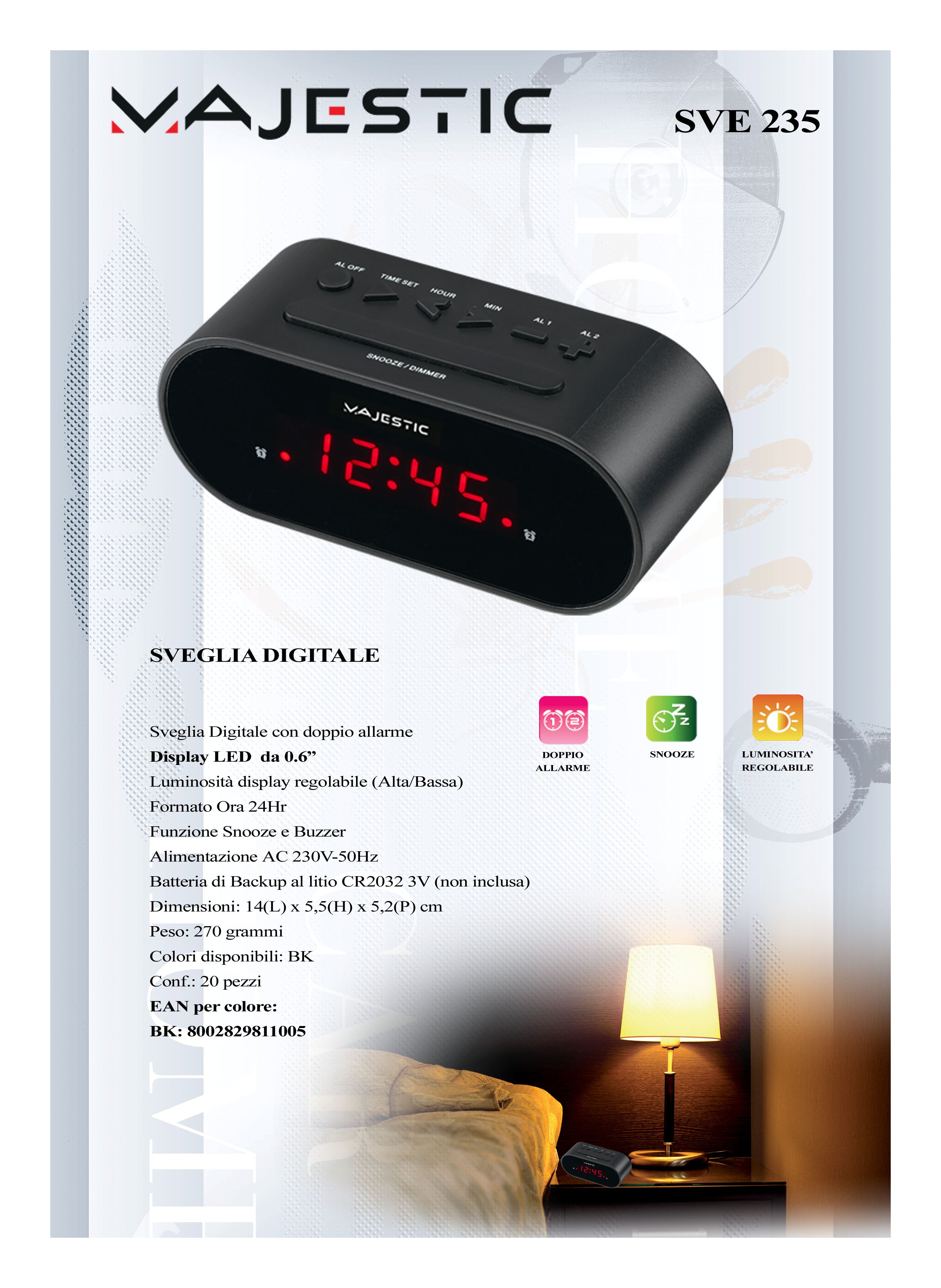 Sveglia - Posizionabile a tavolo - Con orologio digitale - Alimentazione a Rete - Luminosità display regolabile (Alta/Bassa) Funzione Snooze e Buzzer Batteria di Backup al litio CR2032 3V (non inclusa)