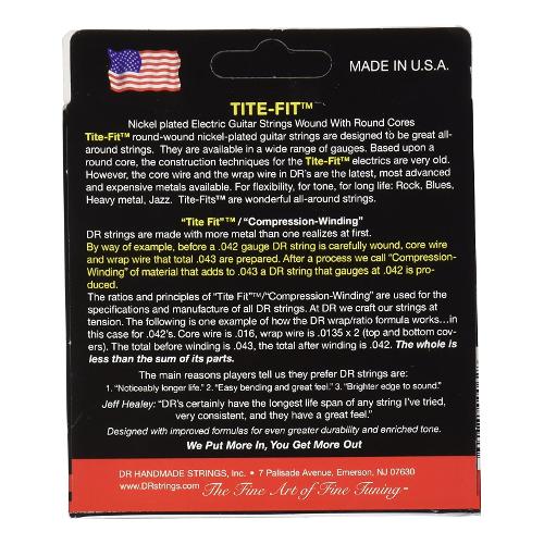 Le corde per chitarra elettrica TITE-FIT utilizzano un filo avvolgente in acciaio nichelato avvolto su un filo con anima tonda per produrre un suono più corposo. Questa costruzione classica rende TITE-FIT un'ottima corda a tutto tondo che funziona per una vasta gamma di stili e generi, tra cui Rock, Blues, Metal e Jazz. Scaltura : 10, 13, 17, 26, 36, 46.