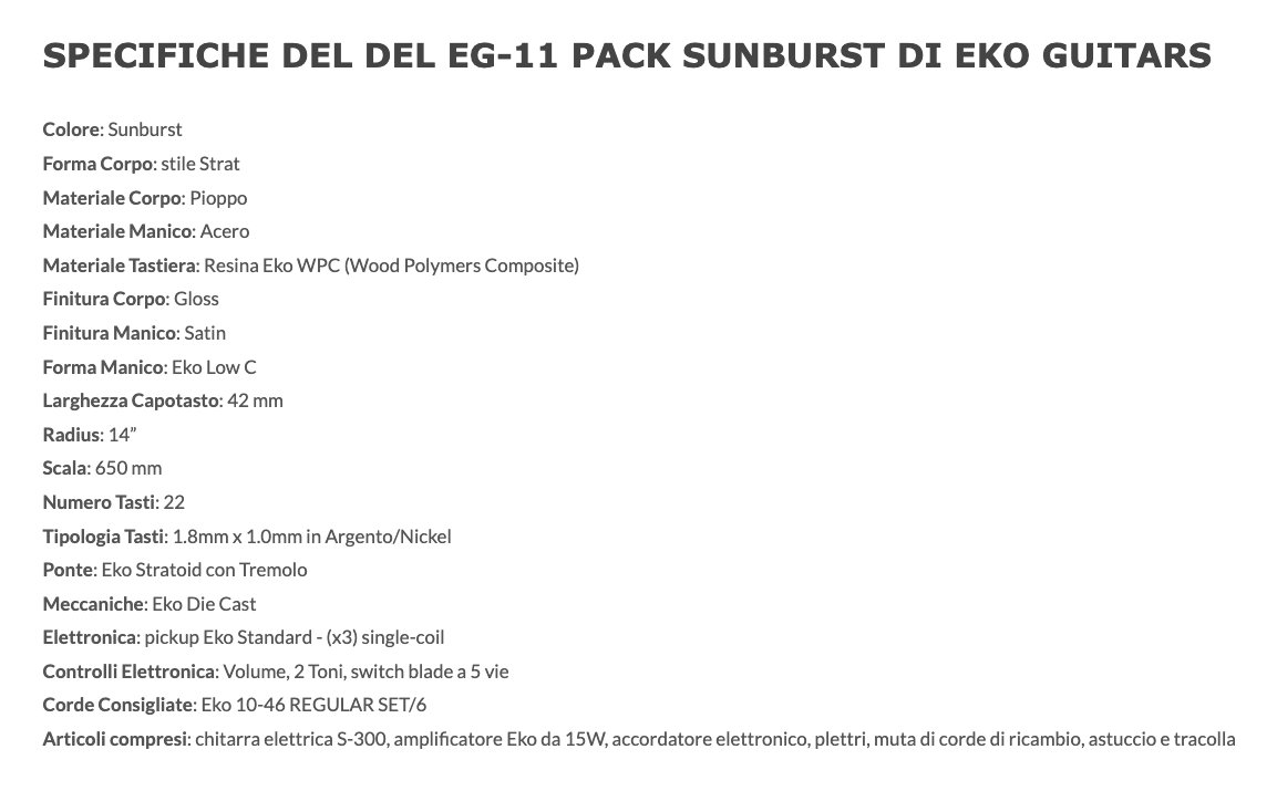 EG-11 PACK Sunburst è il pack dedicato alla chitarra elettrica S-300 della serie "Tribute Starter" di casa Eko Guitars con corpo in Pioppo, manico in Acero e tastiera 22 tasti in resina Eko WPC. Il pack comprende la chitarra elettrica S-300, amplificatore Eko da 15W, accordatore elettronico, plettri, muta di corde di ricambio, astuccio e tracolla. Ideale per chi vuole iniziare lo studio della chitarra elettrica con un'attrezzatura completa e ad un costo abbordabile.
