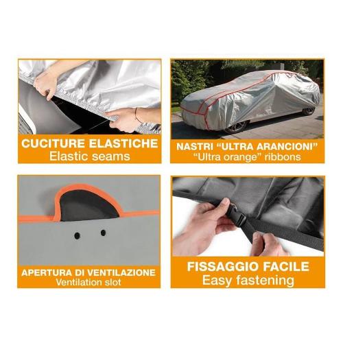 Copriauto antigrandine realizzato in materiale idrorepellente, con rivestimento interno in pile a protezione della vernice ed imbottitura in neoprene da 4 mm nelle zone maggiormente esposte ai danni ovvero cofano/tetto/bagagliaio. Garantito contro grandine fino a 11 mm di diametro e con una velocità di caduta fino a 70 km/h. Provvisto di 2 aperture di ventilazione per permettere un buon passaggio dell'aria ed evitare la formazione di condensa. Con 4 elementi catarifrangenti sulla parte esterna e fasce perimetrali ultra arancioni per una migliore visibilità dell'auto. Estremamente semplice da montare su ogni tipo di autovettura grazie alle cuciture elastiche e ad altri specifici accorgimenti