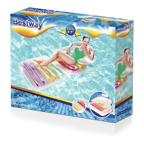 Questo materassino gonfiabile super confortevole ha schienale, braccioli e poggiatesta integrati per il massimo comfort. Inoltre può essere rapidamente trasformata in una poltrona e ha un piano trasparente con struttura a i-beam multicolore.