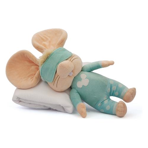 Topo Gigio in pigiama peluche. Basta abbassargli la mascherina sugli occhi per farlo dormire e russare; si muove anche il pancino! Necessita di 3 batterie tipo AA 1,5V (non incluse)