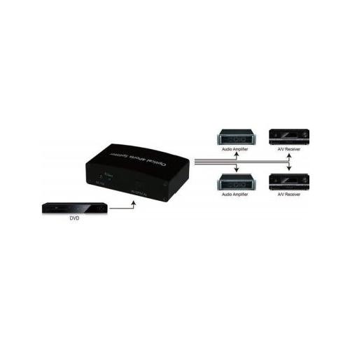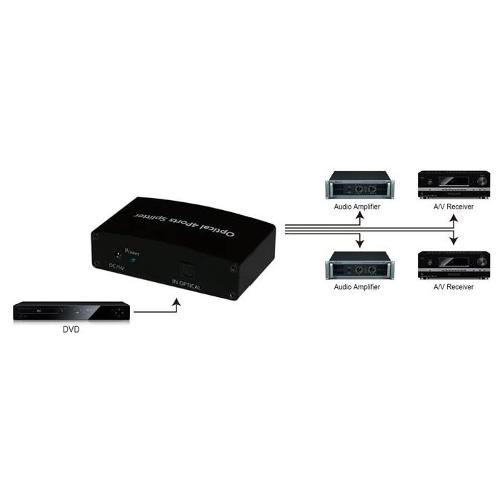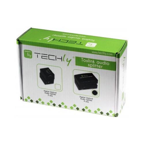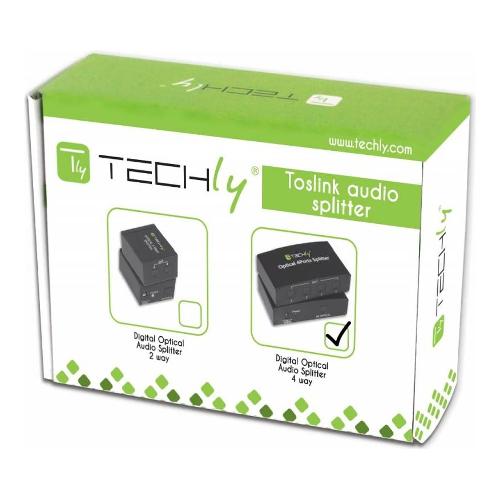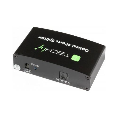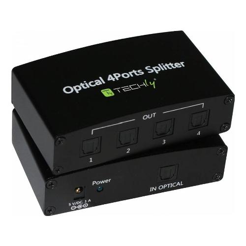 Splitter audio ottico digitale a 4 vie, adatto per distribuire il segnale audio da un ingresso ottico digitale a quattro uscite, usando cavi TOSLink (fibra ottica). I cavi in fibra ottica che connettono entrambi i lati dell’unità possono raggiungere una distanza di 5m permettendo una trasmissione del segnale audio affidabile e senza alcuna perdita di qualità. Lo splitter è compatto e facile da installare, è consigliato sia per l’ambito domestico che professionale.
