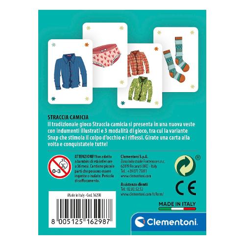 Uno dei giochi di carte più tradizionali, straccia camicia, si "veste" di una speciale grafica e di un formato tascabile per portare il divertimento sempre con sé! Il mazzo di carte viene diviso in tanti mazzetti uguali da distribuire a ogni giocatore. Le carte vincenti sono l'1, il 2 e il 3. A turno i giocatori mettono in mezzo la prima carta del loro mazzo. Quando un giocatore gioca una delle carte vincenti il giocatore successivo è costretto a girare 1, 2 o 3 carte a seconda del numero indicato nella carta vincente giocata. Se durante questa giocata esce un'altra carta vincente l'obbligo si interrompe e toccherà al giocatore ancora successivo girare 1, 2 o 3 carte. Vince chi riesce a lasciare senza carte gli avversari. Il gioco include un mazzo di carte con le illustrazioni degli indumenti e i numeri 1-2-3 e una modalità di gioco speciale per lanciarsi in divertenti sfide con amici e parenti!