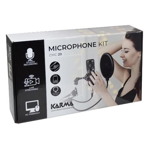 Nella confezione è presente sia il microfono a condensatore in stile studio di registrazione sia il braccio a triplo snodo applicabile a tavoli di qualsiasi genere e orientabile a piacemento. Il braccio termina con un supporto microfonico ammortizzato per l'alloggiamento del microfono stesso. La confezione include anche un cavo microfonico da 2,5m con connettore XLR e 3,5mm destinato a computer. Per chi dovesse possedere computer sprovvisti di presa microfonica, è presente un adattatore USB. Completa il Kit un pratico parasoffi che rende professionale l'uso di questo set microfonico. Utile a cantanti e youtuber.