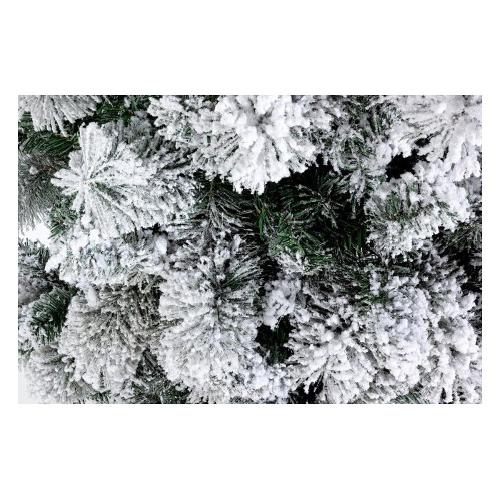 Albero innevato. Struttura e base in metallo. Materiale degli aghi pvc. Rami effetto spazzola che riproducono la struttura degli aghi di pino. Rami ad uncino. Cartone effetto legno con etichetta colorata