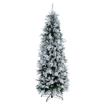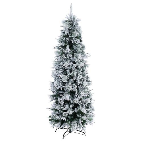 Albero slim innevato. Struttura dei rami e base in metallo. Materiale degli aghi pe stampato ad iniezione e pvc. Rami effetto spazzola che riproducono la struttura degli aghi di pino. Apertura facilitata ad ombrello. Cartone effetto legno con etichetta colorata