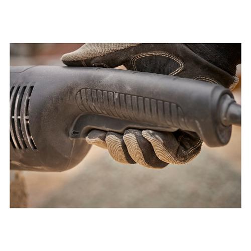 Smerigliatrice potente per applicazioni esigenti. Trasmissione ingranaggi metallici per maggior durata e resistenza. Interrutture con blocco di sicurezza contro gli avvii accidentali. Impugnatura laterale a 3 posizioni per maggior comfort d'uso