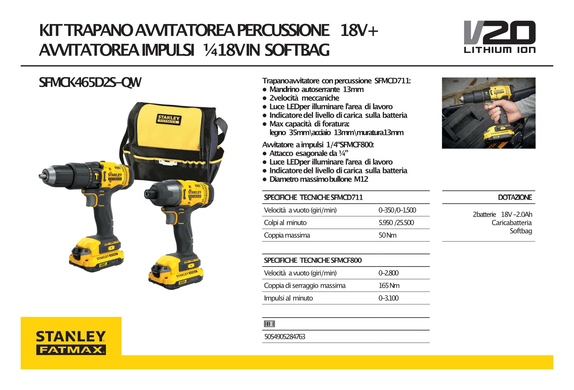 Set elettroutensili a batteria in pratica borsa soft composto da: trapano avvitatore a percussione 5950-25500 colpi/min con mandrino autoserrante 13 mm, 2 velocità meccaniche 0-350/0-1500 giri/min, coppia massima 50 Nm, capacità foratura muro 13 mm, acciaio 13 mm e legno 35 mm;