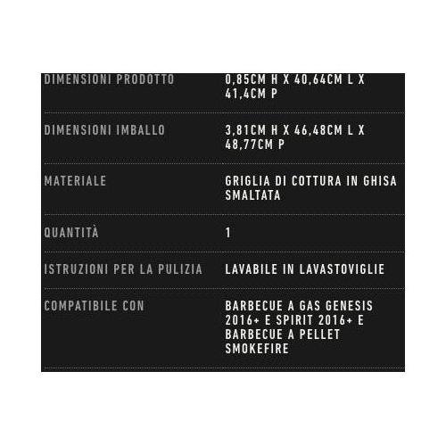 Porta la tua cucina all'aperto e prepara piatti inediti sul tuo barbecue con il WEBER CRAFTED Gourmet BBQ System. Basta sostituire la griglia di cottura sul lato destro con la griglia per rosolatura a doppio lato WEBER CRAFTED per grigliare bistecche, frutti di mare e altro ancora nel tuo giardino. Barbecue, telaio di supporto e griglie di cottura compatibili con WEBER CRAFTED necessari per l'uso. • Crea le perfette striature della cottura sulla griglia • Telaio di supporto e griglie WEBER CRAFTED necessari • Progettata per grigliare la carne su un lato e il cibo delicato sull'altro • La superficie smaltata consente di rigirare e sollevare il cibo facilmente • Superficie extra large per grigliare più bistecche contemporaneamente • Verificare che il barbecue sia compatibile con gli accessori WEBER CRAFTED Compatibile con: Barbecue a gas Genesis 2016+ e Spirit 2016+ e barbecue a pellet SmokeFire
