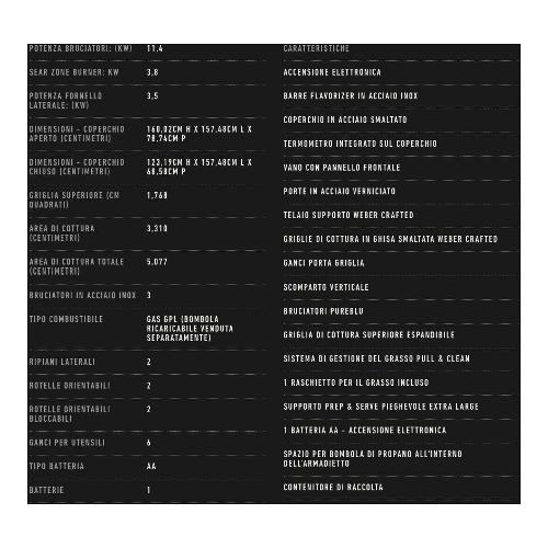 Ti presentiamo il nuovissimo barbecue a gas Genesis, la più grande innovazione nel campo della cottura sul barbecue degli ultimi decenni, con il quale potrai creare un'esperienza culinaria completa direttamente in giardino. Con il nuovissimo barbecue a gas Genesis puoi grigliare, cuocere pane e dolci e persino far saltare le pietanze in padella. La compatibilità con gli accessori della linea WEBER CRAFTED Gourmet BBQ System offre infinite possibilità culinarie, consentendo di preparare piatti nuovi e innovativi sul barbecue. Grazie alla più ampia e calda zona di rosolatura Weber e alla griglia di cottura superiore espandibile, potrai cucinare un pasto completo da gourmet, direttamente in giardino, al centro della festa. • Telaio supporto WEBER CRAFTED; espandi il tuo menu con accessori personalizzati • Cucina più bistecche contemporaneamente sulla zona di rosolatura extra large • La griglia di cottura superiore espandibile crea un secondo livello di cottura • Supporto prep & serve pieghevole extra large • Salta in padella, bolli l'acqua e riscalda le salse sul bruciatore laterale
