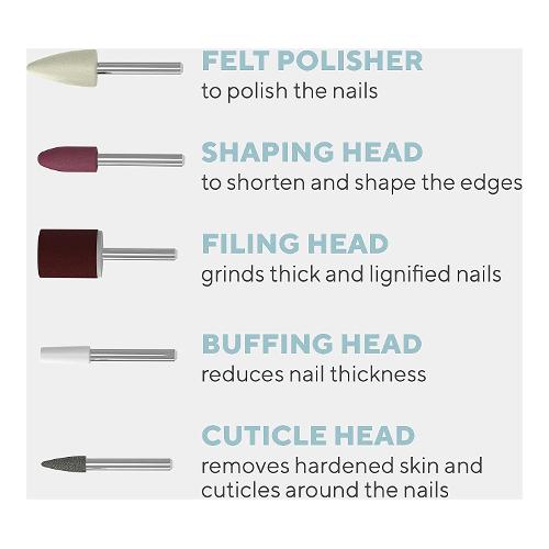 Risparmiate un appuntamento e concedetevi ogni volta una manicure/pedicure di qualità da salone, comodamente da casa vostra. Sono inclusi lo FELT POLISHER: per lucidare le unghie|TESTA DI FORMAZIONE: per accorciare e modellare i bordi|TESTA DI RIEMPIMENTO: macina unghie spesse e legnose|TESTA DI FUSIONE: riduce le unghie spesse|TESTA DI PROTEZIONE DELLA PELLE: rimuove la pelle indurita e le cuticole intorno alle unghie.