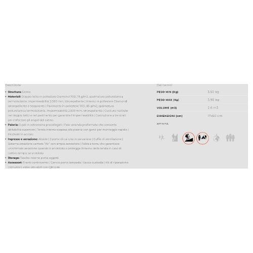 Con abside, 2 porte di cui una in zanzariera, cuffie di ventilazione e sistema areazione camera “air” con ampia zanzariera. La falda a terra, garantisce un'ottimale aerazione quando è arrotolata e protegge l'interno della tenda in caso di cattivo tempo, se srotolata