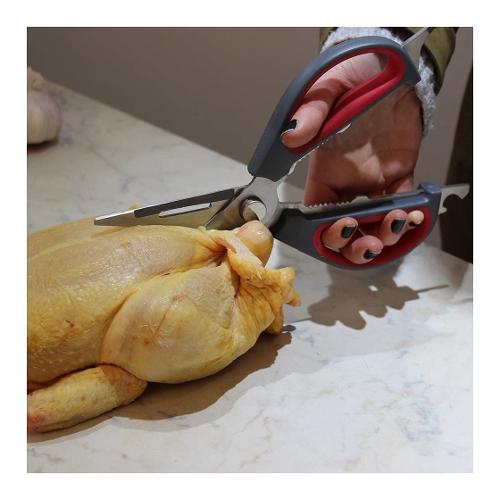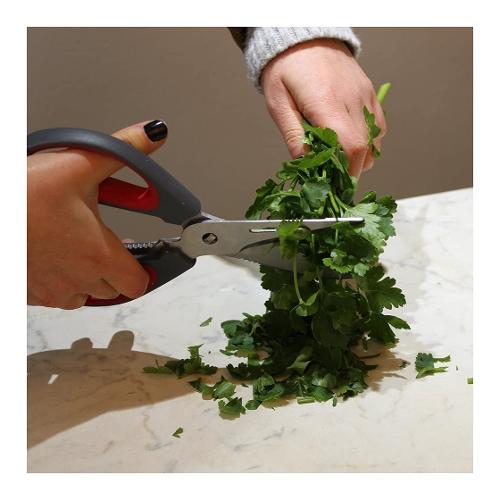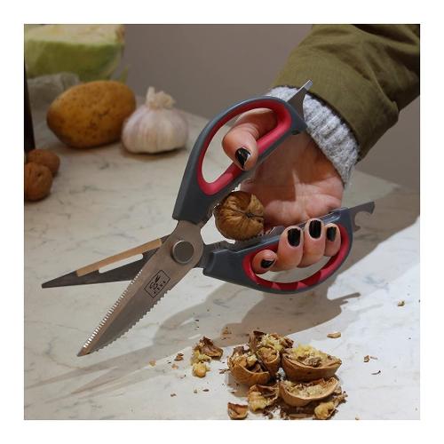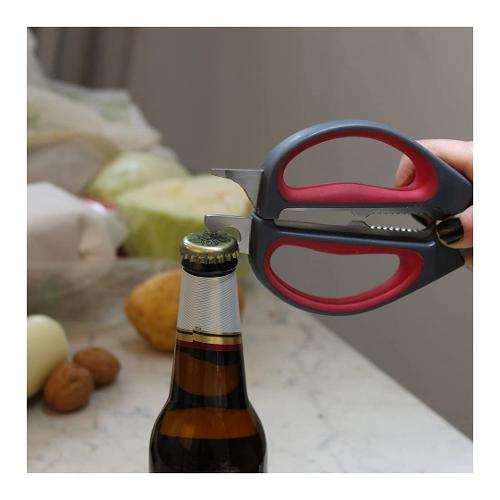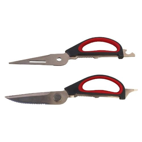 Forbice che si divide in due coltelli. Ideale per tagliare la carne, pelare e togliere squame dal pesce. Con apri bottiglie e barattolo integrato.