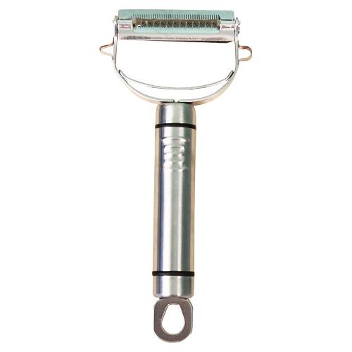 Peeler con doppia lama fissa per taglio julienne e per pelare. Dentato, autoaffilante. Dotato di archetti laterali per incisioni e decori su frutta e verdura. Manico ergonomico antiscivolo. Può essere usato con l'apposita piastra d'appoggio salvadita in abs. Realizzato in acciaio inox