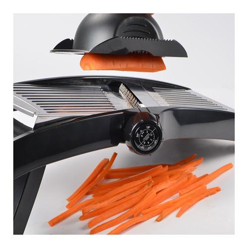 Affettatrice manuale completa di tampone salvadita. 5 posizioni di taglio con spessori diversi per taglio a fette e a julienne. Articolo indispensabile in cucina, permette di realizzare fette e bastoncini di verdura in pochi secondi.