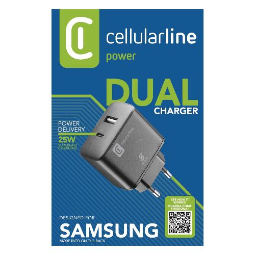 DUAL SUPER FAST CHARGER è il caricabatterie da rete che offre la soluzione perfetta per caricare contemporaneamente due dispositivi Samsung rendendo possibile utilizzare sia il cavo USB-C to USB-C contenuto nella confezione dei nuovi Samsung dalla gamma Galaxy S21 sia i cavi USB. Se utilizzata singolarmente, la porta USB-C grazie alla tecnologia Super Fast Charging 25W eroga la massima velocità di carica per i dispositivi Samsung. Con l'utilizzo in contemporanea delle due porte, il caricabatterie riduce la potenza massima erogata a 15W totali per garantire la ricarica in assoluta sicurezza.