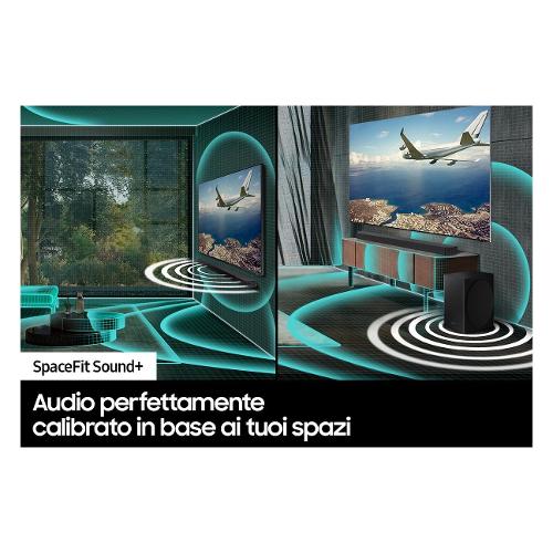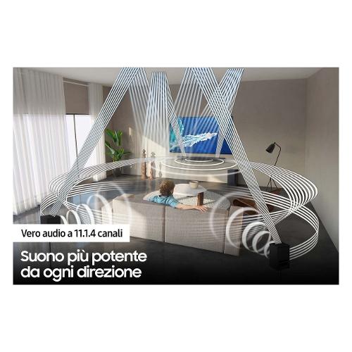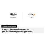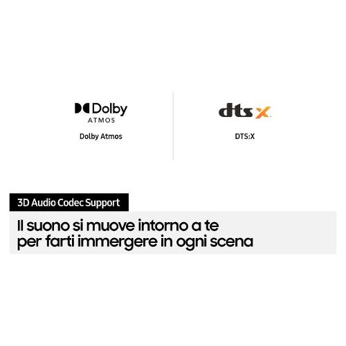 La soundbar Q950A Samsung combina Dolby Atmos e DTS:X creando uno strabiliante audio surround 3D. Vibra al rombo di un aereo. Individua esplosioni in lontananza. Senti la pioggia della foresta amazzonica cadere su di te, proprio come se fossi lì.
