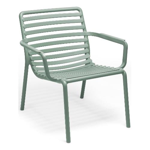 Rilassante ampia poltroncina ribassata per l’esterno in resina fiberglass contraddistinta da un gioco di pieni e di vuoti scanditi da una sequenza di doghe orizzontali. Impilabile, facilmente igienizzabile e riciclabile