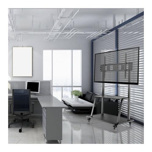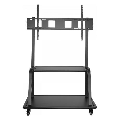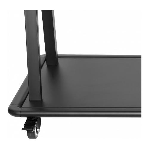 Il robusto carrello TVCART3 di V7 è stato concepito per trasportare display di grandi dimensioni e IFP. Può supportare display con diagonale fino a 105 pollici, per un trasporto semplice a scuola o in ufficio. È dotato di un'ampia base con ruote per la massima stabilità e un sistema di bloccaggio delle rotelle per una maggiore mobilità e sicurezza. Inoltre, è dotato di due scaffali integrati per attrezzature AV e accessori