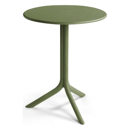 Tavolino d’appoggio in resina fiberglass con piano scatolato tondo caratterizzato da piccoli forellini decorativi e funzionali a renderlo altamente drenante. Base a tre gambe, facile da montare e smontare e proposto con un kit che permette di ottenere due altezze