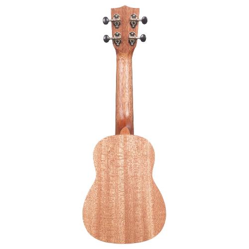 Contraddistinto dalla rosetta a denti di squalo in stile polinesiano inciso, questo ukulele è realizzato in meranti, un legno con molti punti, trattini e macchioline con iridescenza che mette in risalto la grana screziata.
