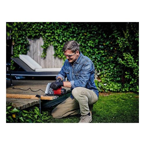 La sega manuale circolare einhell tc-cs 1410 eccelle per la facilità di manipolazione e una potenza di 1.410 watt. L'uso di sega circolare manuale è raccomandabile quando si rendono necessarie robustezza di prestazioni e facilità di manipolazione. La sega circolare manuale permette di eseguire facilmente tagli di vario tipo, su svariati materiali per cui è idonea per molteplici applicazioni. Le seghe circolari manuali sono ideali per le operazioni di taglio prolungate, rettilinee e precise. La guida di scorrimento einhell compatibile è il supporto ideale per incrementare la precisione. L'impostazione della profondità di taglio e dell'angolo di inclinazione avviene senza la necessità di attrezzi; inoltre il blocco del mandrino rende estremamente maneggevole la sostituzione della lama. Nella dotazione di consegna è inclusa una lama dentata in metallo rigido per un taglio netto e preciso; la sega manuale è compatibile con lame dentate con 30 mm di diametro interno. La profondità di taglio massima a 45 gradi di inclinazione raggiunge i 46 mm, a 90 gradi di inclinazione la profondità di taglio raggiunge i 67 mm. La grande impugnatura supplementare attenua lo sforzo anche durante le sessioni di lavoro più prolungate. Un cuneo divisore contribuisce anche a incrementare la sicurezza di esercizio. La sega circolare manuale dispone di attacco per aspirapolvere compatibile che permette di mantenere la pulizia dell'area di lavoro
