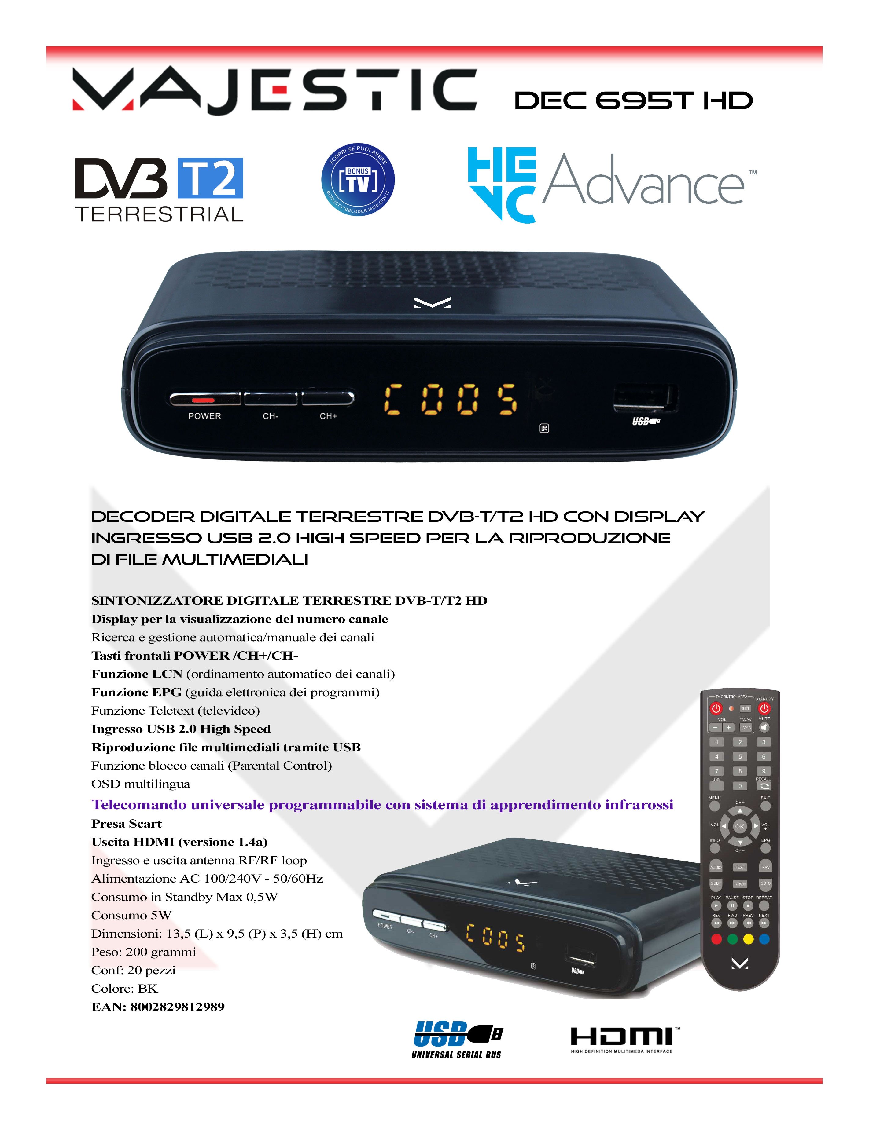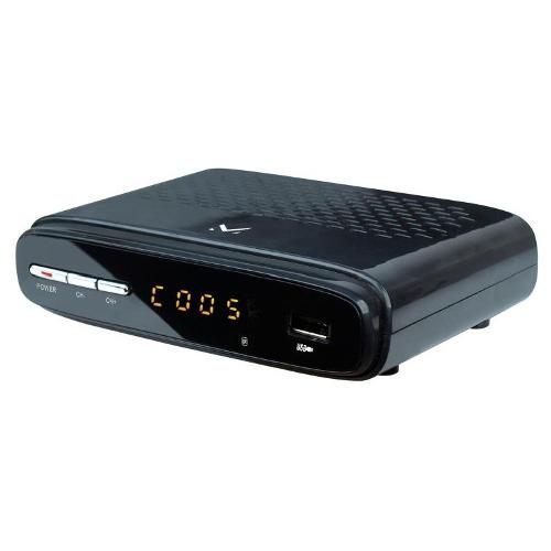 Decoder digitale terrestre DVB-T/T2 HD con display e ingresso USB per la riproduzione di file multimediali.