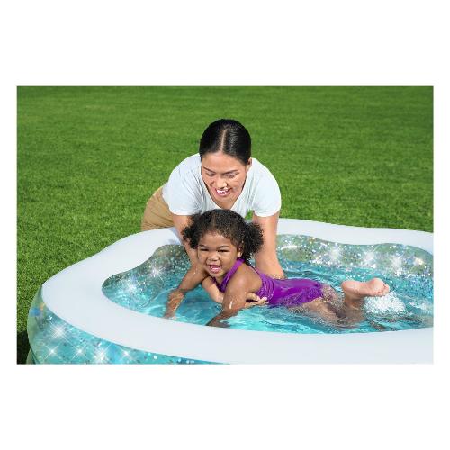La piscina per bambini Bestway® Sparkle Shell™ è della dimensione perfetta per le famiglie con bambini di tutte le età e ha la giusta profondità per far sguazzare e giocare i bambini. Le pratiche dimensioni assicurano che anche le persone con piccoli giardini possano divertirsi in acqua sotto il sole estivo. La piscina per bambini è caratterizzata da pareti laterali trasparenti piene di glitter scintillanti. Ha una forma a conchiglia unica che porta la sensazione del mare direttamente nel tuo giardino. Riempi d'acqua, sabbia o gioca con le palline per l'uso tutto l'anno di questa piscina per bambini luminosa e scintillante. È facile da gonfiare e sgonfiare, rendendo lo stoccaggio un gioco da ragazzi.