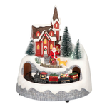 Villaggio h21,5cm paesaggio con babbo e cane, trenino rotante in galleria led color, luce fissa, musica natalizia (8 motivi ripetuti in sequenza) disattivabile con interruttore on1 (con musica) - off - on2 (senza musica), a batteria 3xaa 1,5v (non incluse), porta batterie integrato, ip20