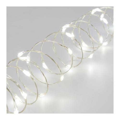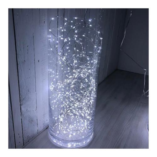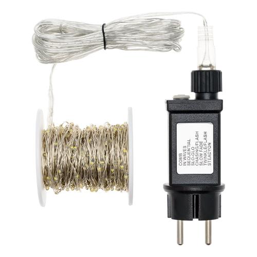 Catena lineare mc 400 microled bianco ø1,5mm, cavo metallo argento metal silver, memory controller 8 giochi di luce selezionabili integrato nel trasformatore, ip44 uso esterno, cavo di alimentazione trasparente, dimensioni 4+20m, bobina in plastica rigida inclusa, scatola lusso color (xkc art. M400-c s).