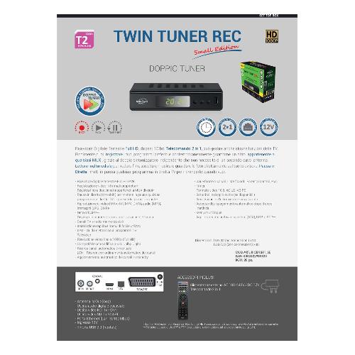 Ricevitore Digitale Terrestre Full HD, dalle dimensioni ridotte, chipset 10 bit. Telecomando 2 in 1, può gestire anche alcune funzioni della TV. Finalmente puoi registrare i tuoi programmi preferiti e contemporaneamente guardarne un altro appartenente a qualsiasi MUX , grazie al doppio sintonizzatore indipendente che non necessita di un secondo cavo antenna. Lettore multimediale per vedere film, ascoltare musica o guardare le foto direttamente sul tuo televisore.