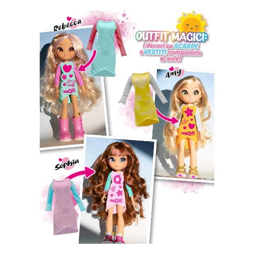 La fantastica bambola i cui occhi, oltre a seguire lo sguardo... cambiano anche colore! La magia del cambio di colore avviene quando la fashion doll è esposta al sole per alcuni secondi. Ma non è tutto! Al sole appaiono anche magicamente dei decori sul vestito extra e sulle scarpe!