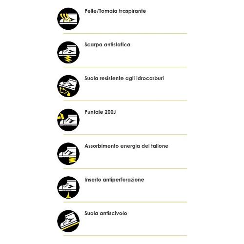 Pelle crosta scamosciata e mesh con sistema di traspirazione laterale . Puntale in alluminio 200J.Fodera in Nylon ultra traspirante, plantare traspirante . Intersuola e battistrada PU
