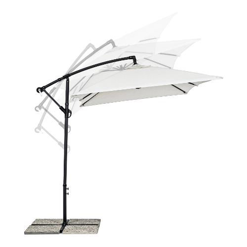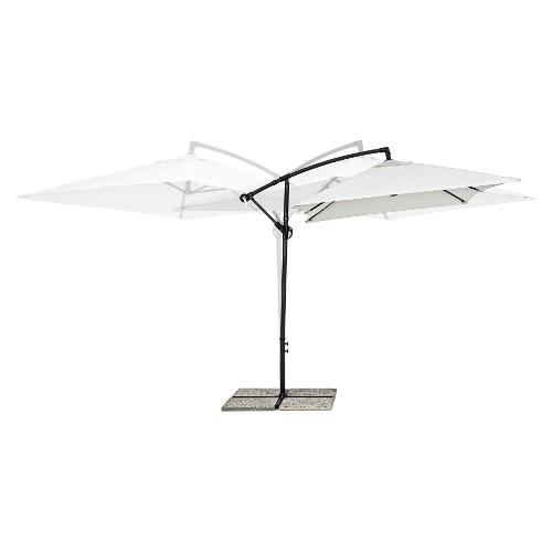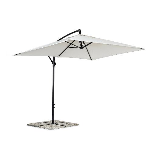 Struttura in acciaio verniciata a polvere (Poliestere). Palo Ø 48 mm. Palo sospeso Ø 42 mm. 6 stecche 12x18 mm. Telo naturale in Poliestere 180 gr/mq con camino antivento. Base a croce in acciaio. Palo girevole 360°manualmente. Marmette non incluse