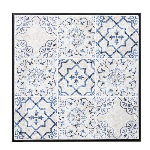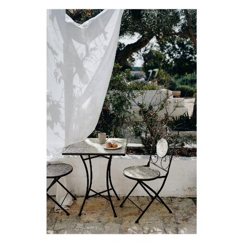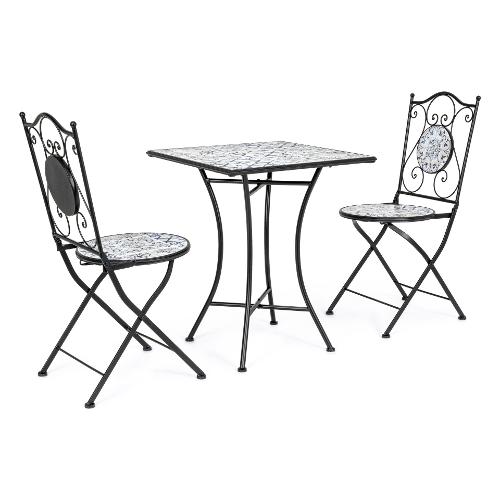 Struttura in acciaio trattato per l'esterno (e-coating) e verniciato a polvere epossidica. Piano, seduta e decori in ceramica. Sedia pieghevole. Tavolo gambe
