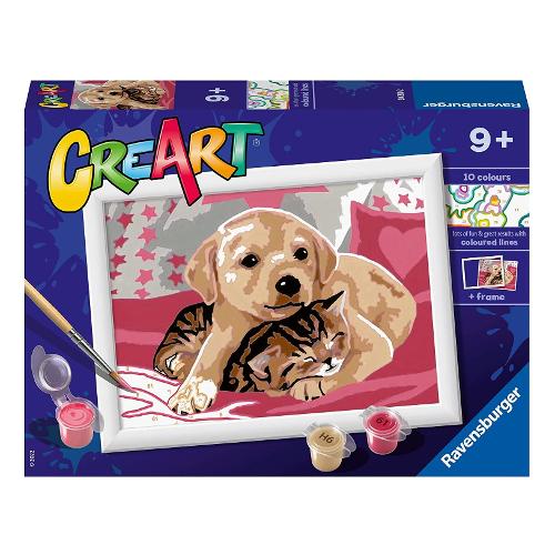 Gioco creativo per dipingere, adatta a maschi e femmine a partire dai 9 anni. Ogni confezione contiene tutto il necessario per dipingere un quadro e una cornice per poter appendere il proprio lavoro una volta terminato il lavoro: una cartella prestampata, 1 pennello di qualità, barattolini di colori richiudibili singolarmente e cornice. Dipingere non è mai stato così facile. Le tavole contengono un tracciato colorato e numerato da dipingere con i colori corrispondenti. Risultato garantito per tutti. Per i bambini dipingere non è mai stato così facile e soddisfacente. CreArt è un gioco creativo per dipingere attraverso una tavola prestampata, i bambini possono seguire i numeri e i bordi colorati per riempire gli spazi con i colori corrispondenti e realizzare la loro opera d’arte. I colori a base d'acqua sono pronti per l'uso e non necessitano alcun solvente. I barattoli di colori sono richiudibili singolarmente per evitare che si secchino. Per facilitare l'attività, viene fornito una tavolozza di cartone dove inserire i barattolini per evitare che si rovescino. Ogni confezione contiene tutto il necessario per dipingere un quadro.