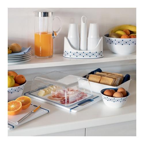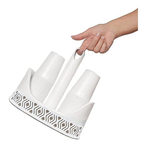 Portabicchieri in plastica, con bordo rialzato e supporto anticaduta interno a protezione dei bicchieri monouso. Decorato con particolari intarsi in color tortora e palace blu. Può essere facilmente spostato grazie alla presa dinamica, tutto realizzato in materiali di alta qualità, bpa free
