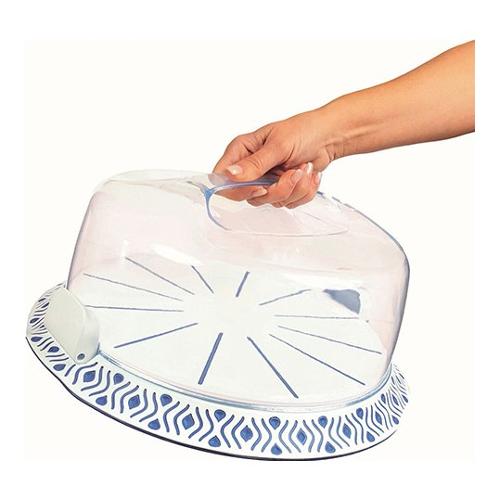 Elegante portatorte con piatto dalla presa ergonomica e decorato con inserti in colore tortora o palace blu. La cupola trasparente comprende una solida maniglia e due clip incorporate per una grande sicurezza nel trasporto e massima conservazione per tutte le vostre creazioni. Il vassoio ha diametro interno da 31 cm, con la suddivisione degli spicchi, per ottenere una fetta prefetta per i vostri dolci. Ideale per torte o anche prodotti salati
