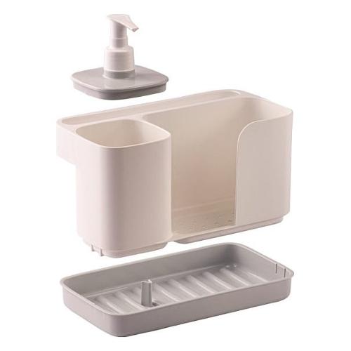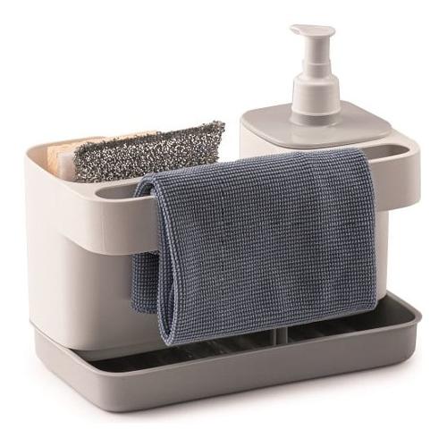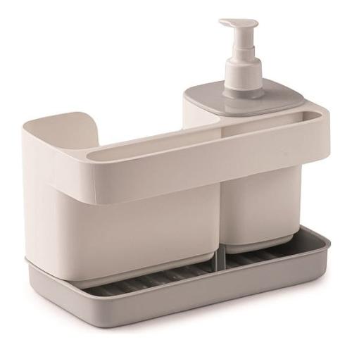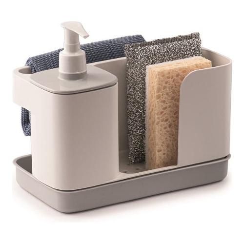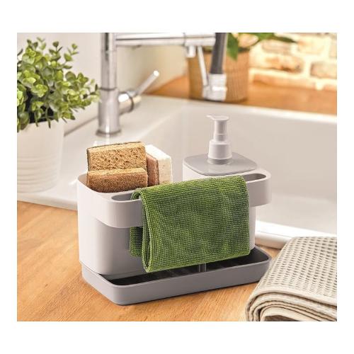 Ideale per avere a portata di mano e sempre in ordine gli accessori per il lavaggio delle stoviglie e del lavandino. In un unico prodotto: dispenser per sapone liquido o detersivo per i piatti, vano per spugne e guanti, supporto per panni e strofinacci. Porta detersivo con dispenser, capacità 0,4 litri. Per disinfettare metti tutto in lavastoviglie senza problemi.