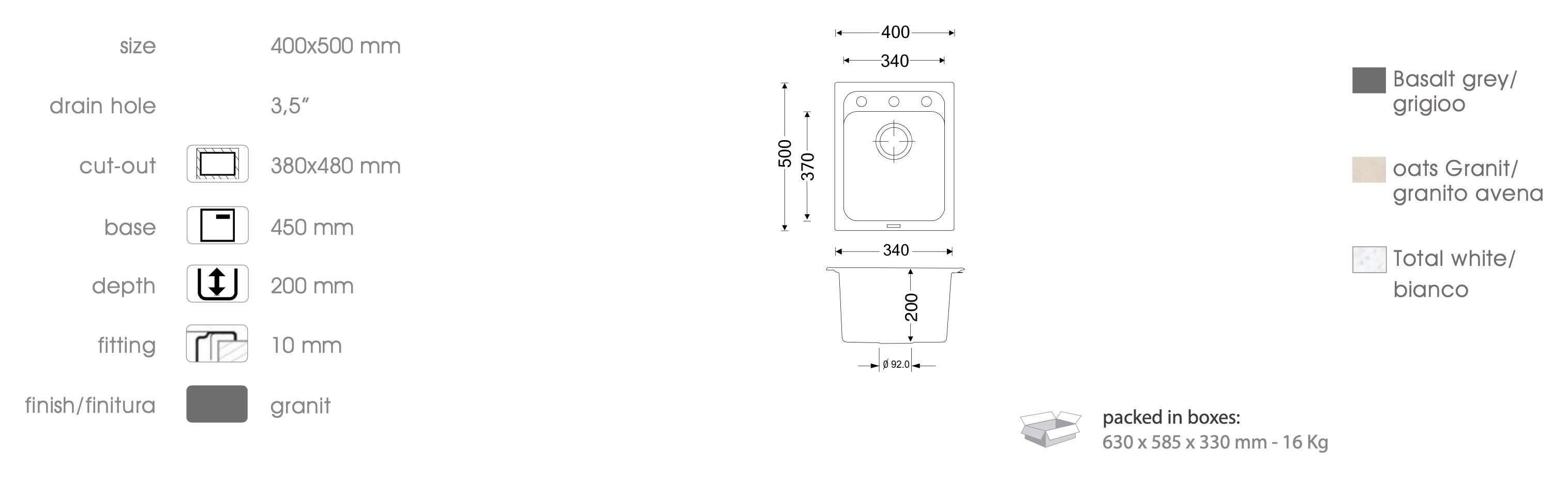 Lavello 1 vasca (40x50cm) PIETRA PLUS Basalto grigio Opaco PTPL400GG