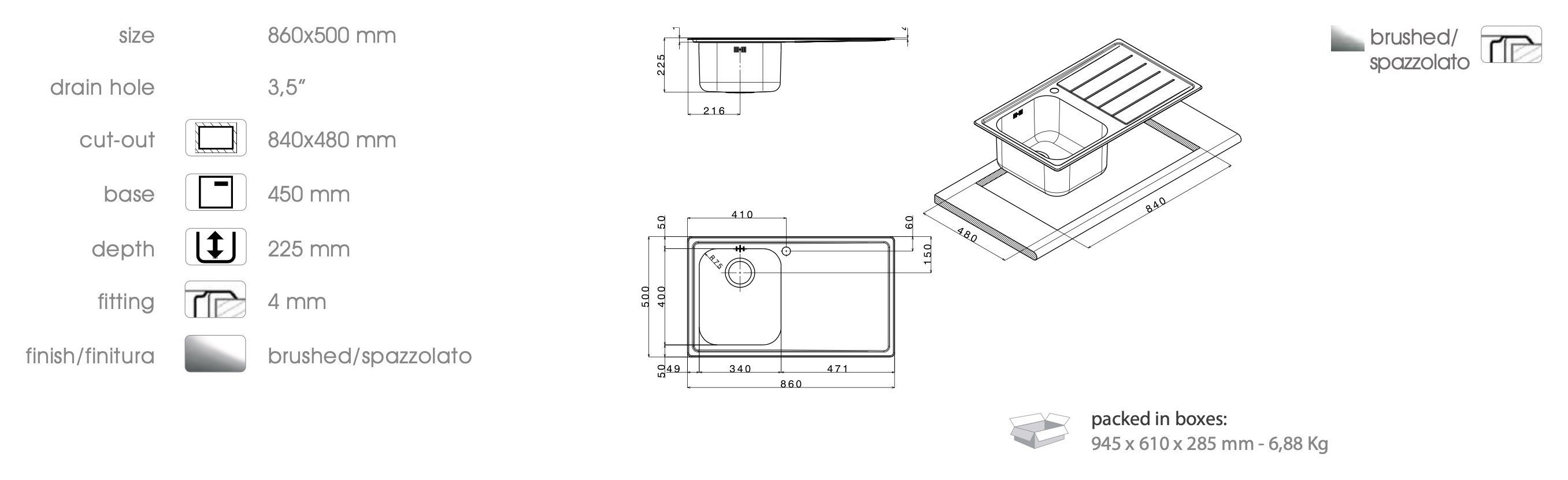 Lavello 1 vasca (86x50cm) LINEAR Inox Spazzolato LN861IRBC